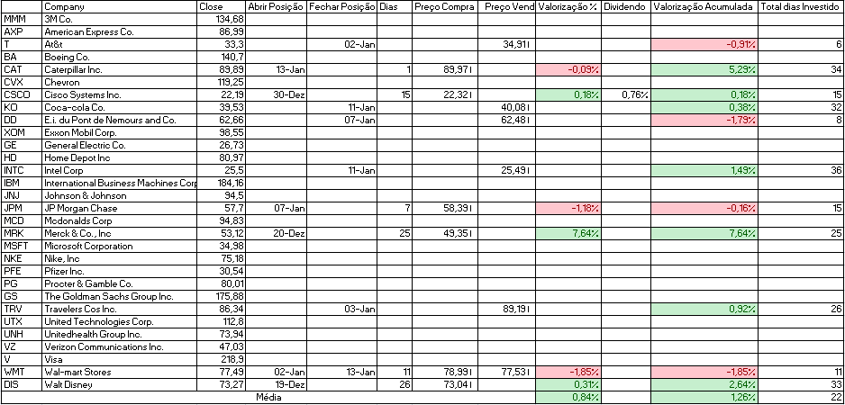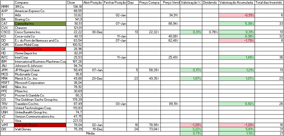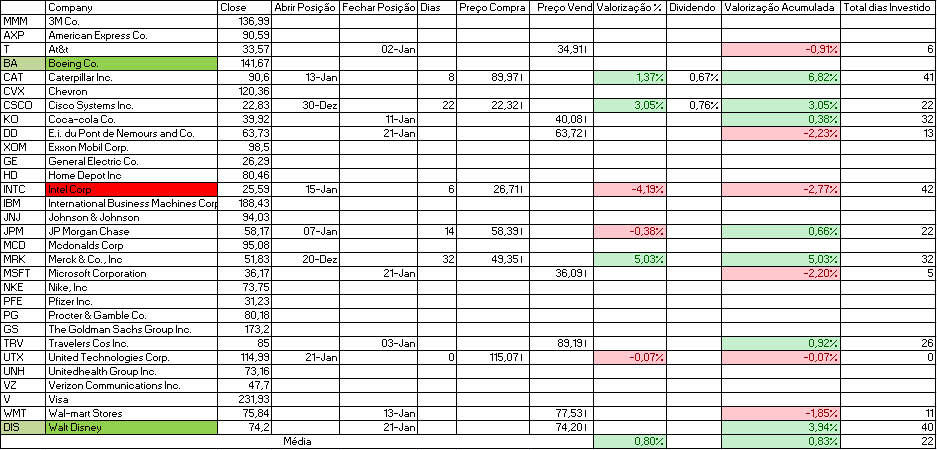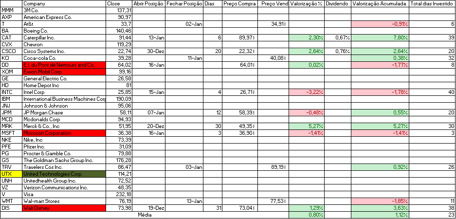 Hoje como indicado adquirimos United Technologies Corp. e vendemos E.i. du Pont de Nemours and Co., Microsoft Corporation e Walt Disney.