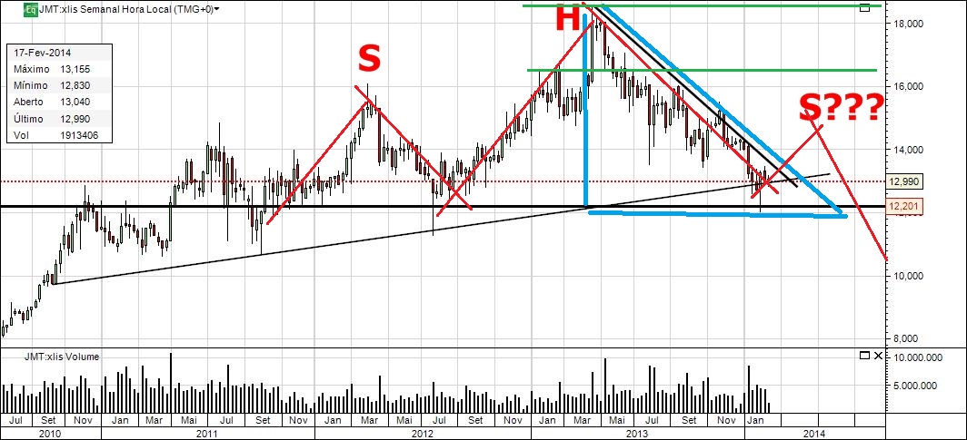 No meu ponto de vista pensar em posições longas na JM, só depois desta cotada recuperar um bocado e ver o preço acima das linhas verdes traçadas no gráfico.