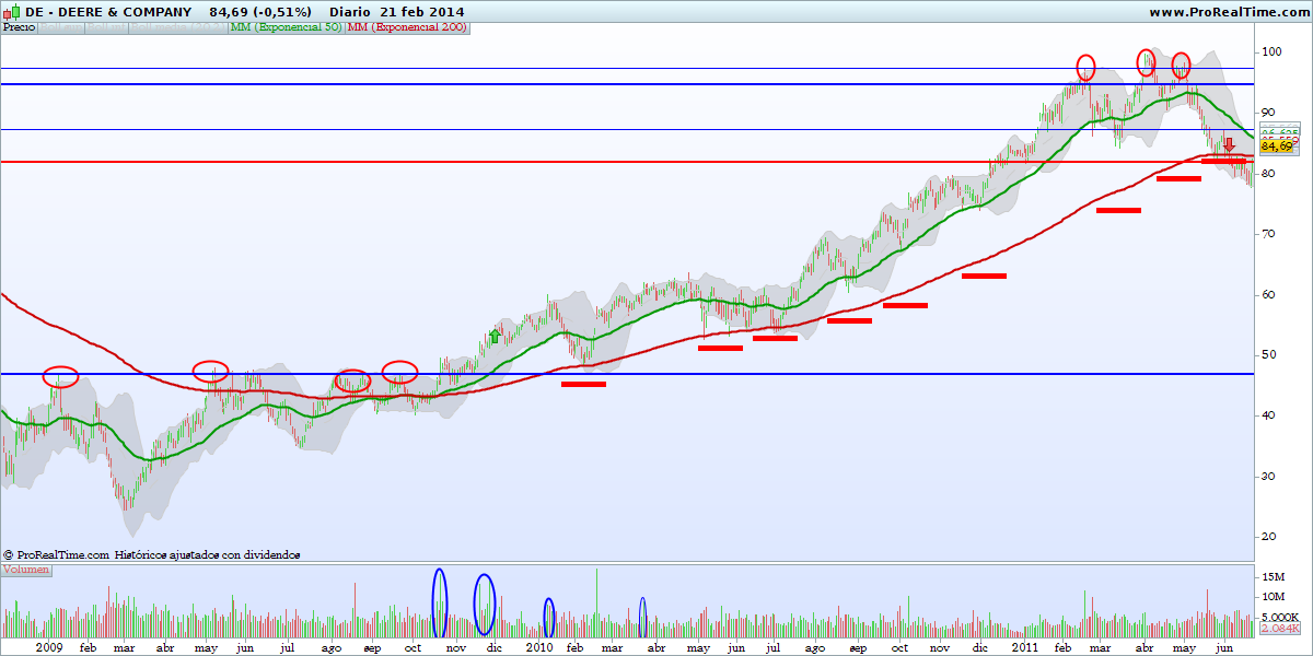 Deixo um gráfico de um dos meus melhores negócios entre 2009 e 2011, A Deere (DE) depois do bear que viveu, criou boas bases, formando uma excelente resistência com cerca de 6 toques, que depois foi quebrada, seguiu-se a golden cross, O tal bom volume de que falo estava lá, os preços estavam acima das mm's e entrei, mantendo a posição até 2011 quando o trailing stop foi ativado. A seta verde foi o momento da compra, a seta vermelha foi o momento da venda. As linhas vermelhas carregadas são as zonas possiveis onde colocaria os trailing stop's até disparar a venda.