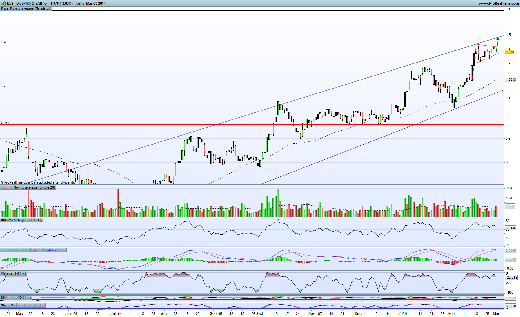 Sai do BES cerca dos 1.38 pois (com os meus poucos conhecimentos) analisando o gráfico estava convencido que iria seguir a tendência e corrigir até cerca dos 1.3 onde entraria novamente.