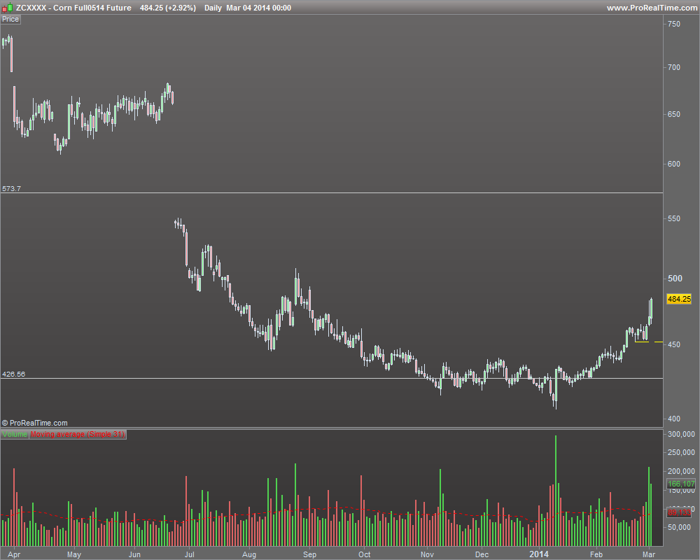 E a mercadoria em questão é o milho. Este ativo parece-me à partida no médio/longo prazo estar balizado por 3 S/R's significativos: O mais elevado na casa dos $780, um intermédio na zona $570, $590 e um mais baixo por volta dos $420. Depois de uma depreciação de mais de 50% desde os anteriores máximos (que julgo históricos), o milho encontra-se desde agosto de 2013 a formar aquilo que me parece uma boa base, em forma de fundo arredondado. Desde o início de fevereiro que se faz notar uma tendência ascendente de muito curto prazo e a valores atuais cota em máximos de 6 meses. Contando já com 3 higher highs e respetivos higher lows, este parece-me um ponto interessante para uma entrada. O stop ficará nos $452, zona dos anteriores mínimos relativos. Ainda não sei exatamente como incorporar o câmbio na folha de controlo da carteira, mas contas redondas e caso satisfeita, a posição valerá 4,6% da carteira.