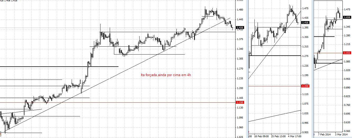 quanto ao time de 4h e de ser um time menor,se querermos descer ainda mais um time e ir ao gráfico de 1h,vemos uma leg up que vem dos 1.04 e que provavelmente chegou ao fim tendo o seu max nos tais 1,495,entrando agora na sua fase descendente,cortando a sua lta alertando -nos para uma possível inversão dessa tendência asc.,mas tendo em conta que se trata de um time menor mesmo com os tais mais de 3 toques,vai-se dar uma olhada aos times uperiores tipo diário e o que se observa é o preço a testar uma zona de suporte com alguma relevância,antiga resistência e ai esperasse para ver o que a acçao vai fazer,se quebrar voltamos a descer aos times dito menores e ai ver algum tipo de reação seja ela em resistência ou suporte.