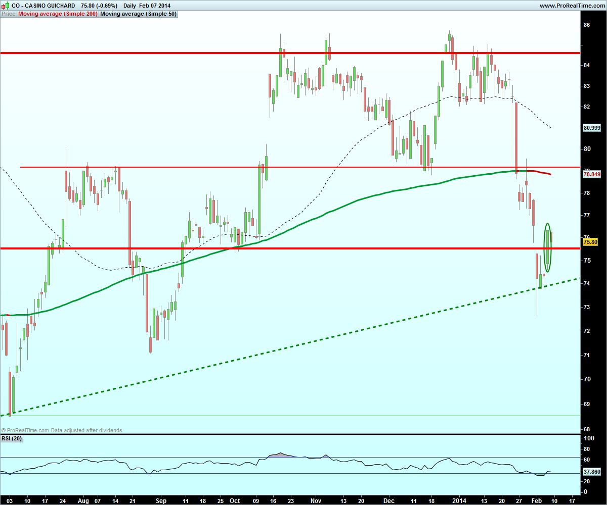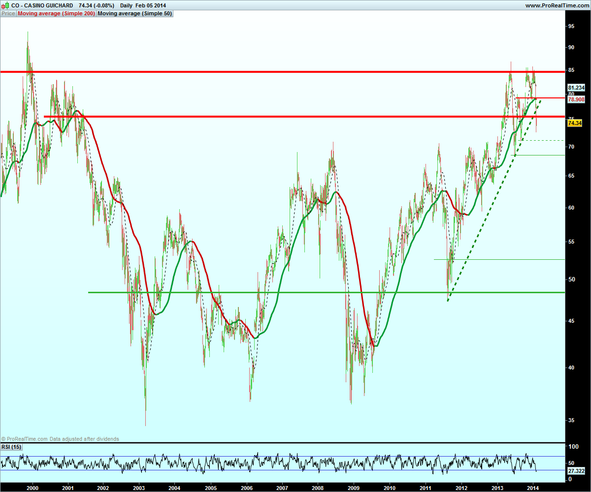 Nova posição short no Casino Guichard-Perrachon (CASP) a 74,85€ com um peso de 25% da carteira. tendo como objectivo os 71,50€ (+4%), e stop nos 77,25€ (-3%).