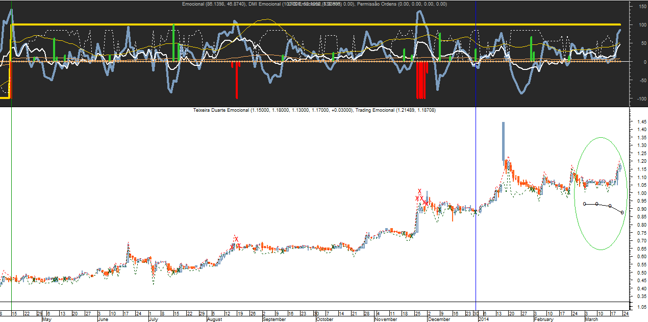 Finalmente, a propósito duma dúvida anterior que ficou pendente no PSI-20, sobre a que nível fecharia o “Emocional 2014” as suas posições compradas, passando de “bull” a neutral com sinal de vendas obtidas através do diagnóstico obtido no gráfico diário, o programa assinala o valor dos 6742 pontos, um nível muito próximo da correção em baixa que o PSI-20 registou há cerca de 1 mês e meio atrás em princípios de Fevereiro.