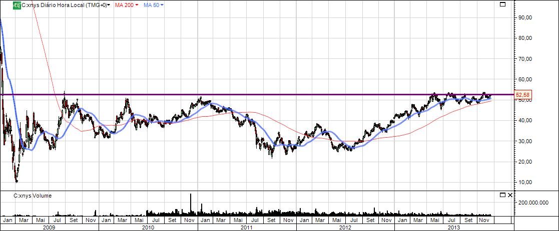 Tem feito uma pequena escalada nos últimos tempos encontrando resistência na zona dos 54 USD.