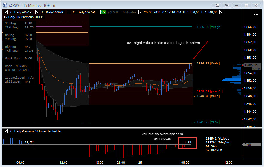 Um range bastante diminuto, de apenas 5.25pts até agora o que nos dá desde já a indicação que iremos ver a quebra de um dos extremos, seja ainda durante o overnight seja durante o cash/pit.