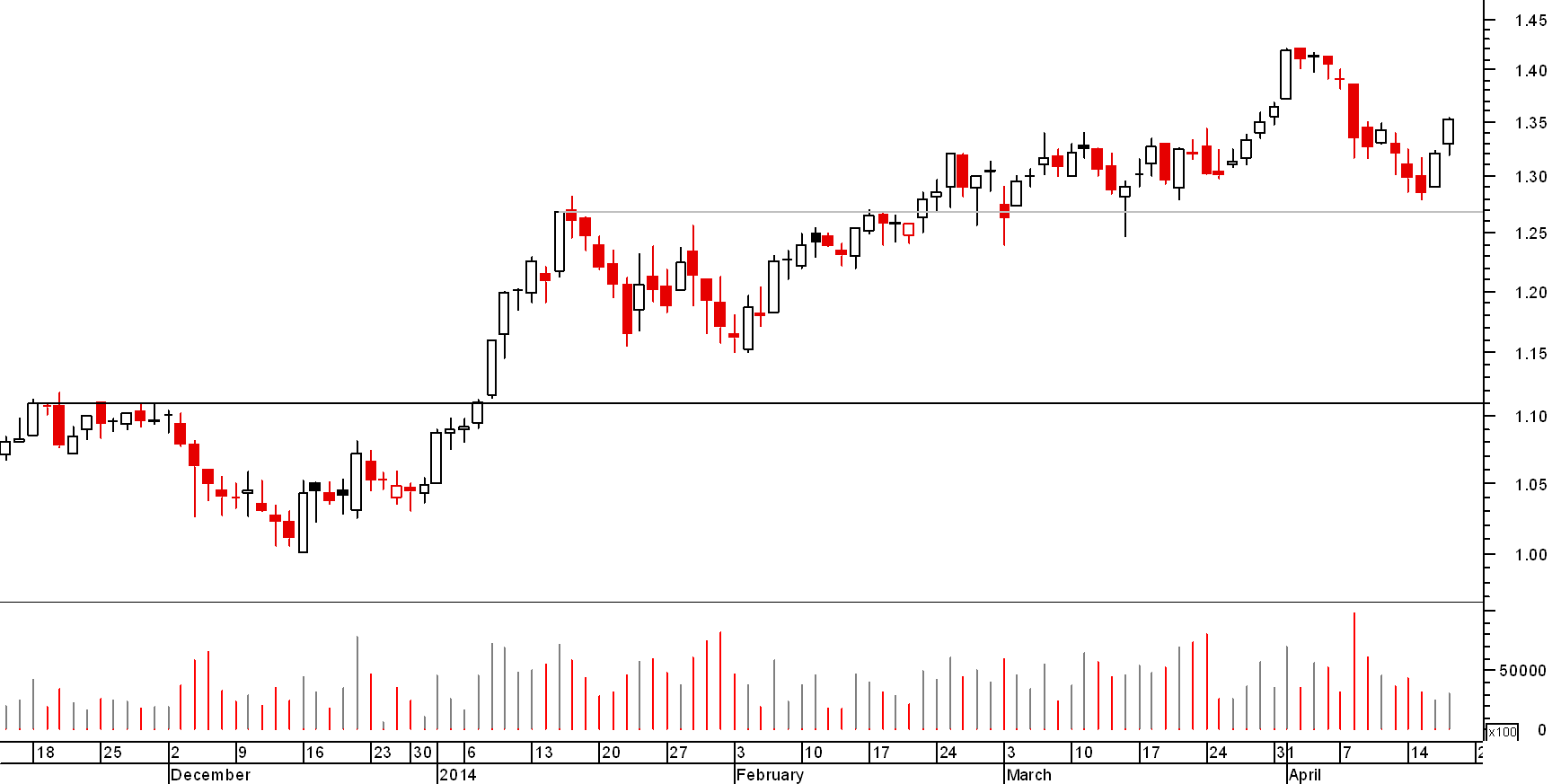 O volume é um excelente indicador! Ontem com aquele volume quase que arrisco a dizer, que teremos mais quedas nos próximos dias mas, mantém o aspecto bull no médio prazo, por isso, mesmo umas correcções pode-lhe fazer bem, para futuras subidas! a resistência situa-se nos 1.75..Acredito que não tenha sido atacada ainda, porque muita gente quer fazer mais valias e isso claro está-se a reflectir na queda da cotação!! Assim que essas mais valias forem realizadas e o valor de 1.42 ultrapassado ( máximo anterior), teremos certamente forte subida e quem sabe, até perto da resistência!! è aguardar e quem está longo ( como eu:-) ), penso que ainda não tem muito a temer!! As subidas nas ultimas semanas foram muito boas, logo umas correcções e tomadas de mais valias, é sempre bom para a consolidação da acção e para a formação de novos suportes ( que neste momento está a cerca de 1.32, com a LT).
