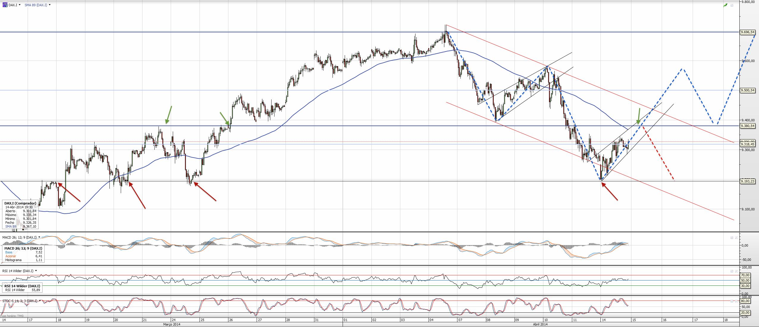 Ainda tenho o meu longo aberto. E espero fechá-lo no topo do canal descendente formado nesta última semana. Depois logo vejo como reaje. Não tenho a plataforma aberta comigo, e não consigo vislumbrar o padrão que se formou entretanto. Se calhar, estou a cometer uma asneira, logo à noite vejo! Até lá ainda bem que fechei os olhos a esta descida abaixo dos 9300