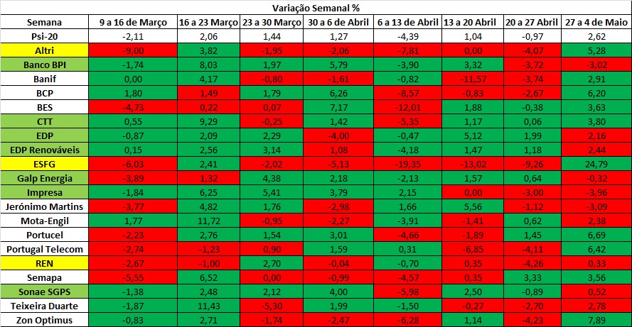 Esta semana, o grande destaque vai para o ESFG. Depois de nas ultimas duas semanas terem sido horríveis para os que estavam longo na acção, nos últimos dias os tubarões entraram na acção, o que levou a uma valorização semanal de 24,79 %. No geral, foi uma semana positiva para quem esteve longo na banca, com bcp a valorizar 6,2% e banif e bes na ordem dos 3%. O BPI continua a corrigir depois de ter apresentado resultados menos bons na semana passada.