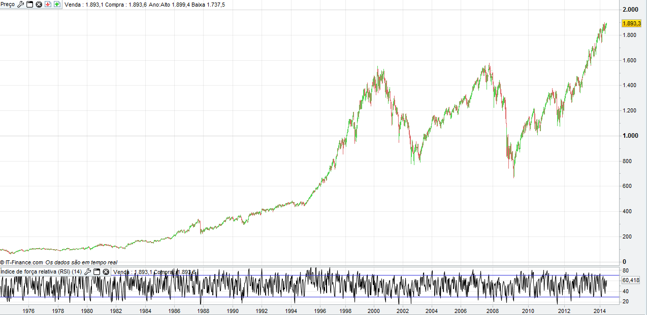 As linhas horizontais servem para destacar a relação do SP500 com os chamados "números redondos". Começa nos 700 e acaba na actualidade. Podemos tirar várias e preciosas ilações.