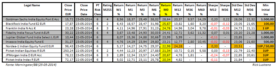 Aquele fundo da Índia do HSBC tem um retorno de 37.5% YTD (uma banhada em toda a concorrência), sendo que em 30/04/2014 tinha 8.7% e passado menos de 1 mês passou para uns brutais 37.5% (será que tinha alguma inside information sobre os então futuros resultados eleitorais?), tendo assim uma subida meteórica de 25.8%.