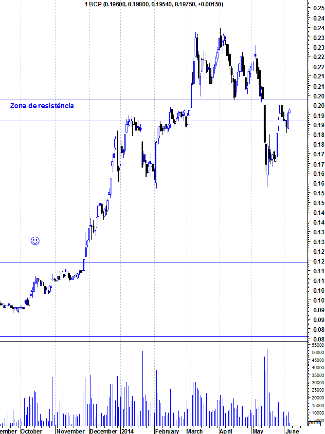 Deixo aqui os gráficos actualizados do BCP, com a acção a namorar a sua zona de resistência.