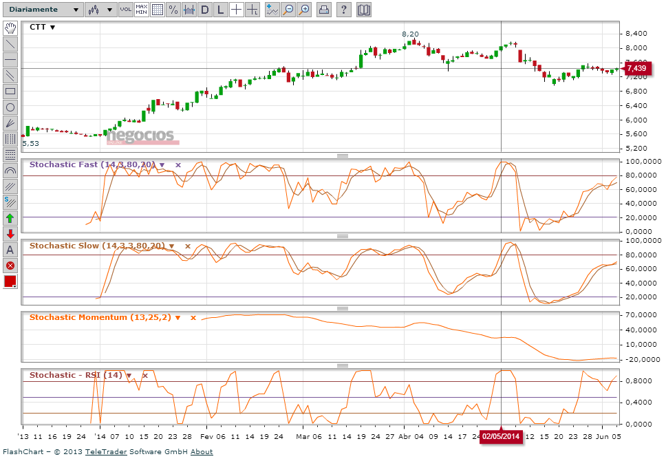 No Gráfico Interactivo do Jornal de Negócios qual é o oscilador estocástico mais usado pelos analistas?
