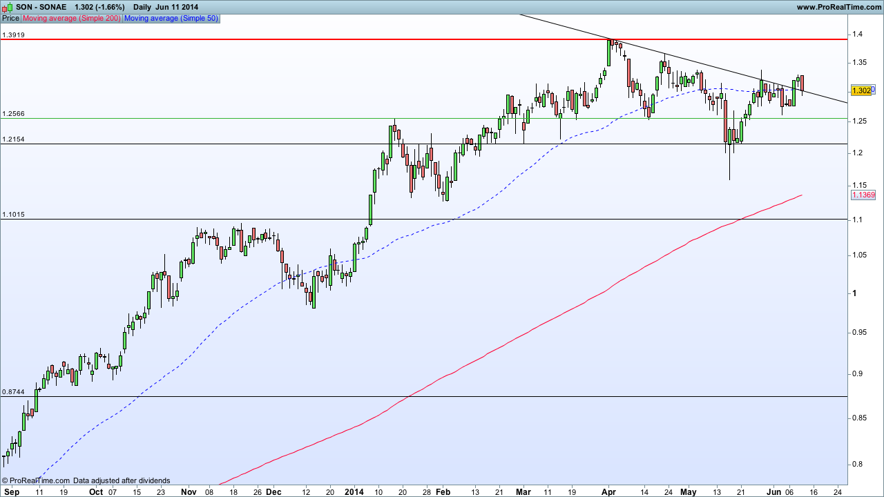 Apesar de os volumes das descidas dos dias 15 de Maio e 4 de Junho serem preocupantes, parece-me que a Sonae ainda tem (muito) espaço para os longos. Neste momento parece estar a lateralizar entre o máximo anterior (1,39€) e os 1,25 - 1€ pelo que não me parece o momento ideal para entrar, seja a entrada longa ou curta visto estarmos precisamente a 7% de distância da resistência e do suporte.