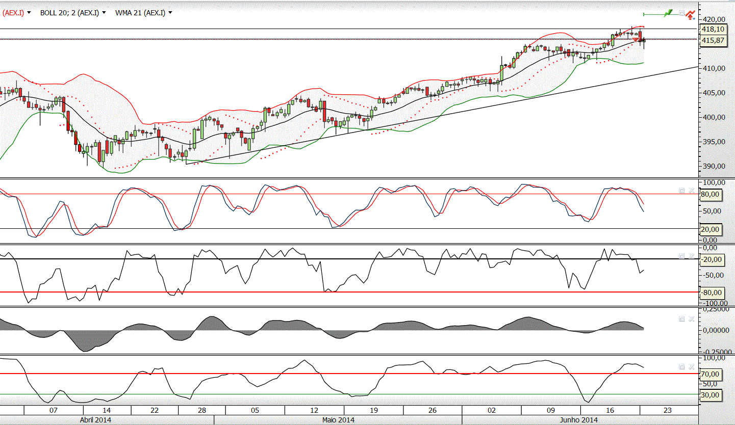 Aparentemente, não logrou ultrapassar a forte resistência situada nos 21430 pontos, nível onde já ocorreram, desde 19.12.2013, pelo menos 7 toques.