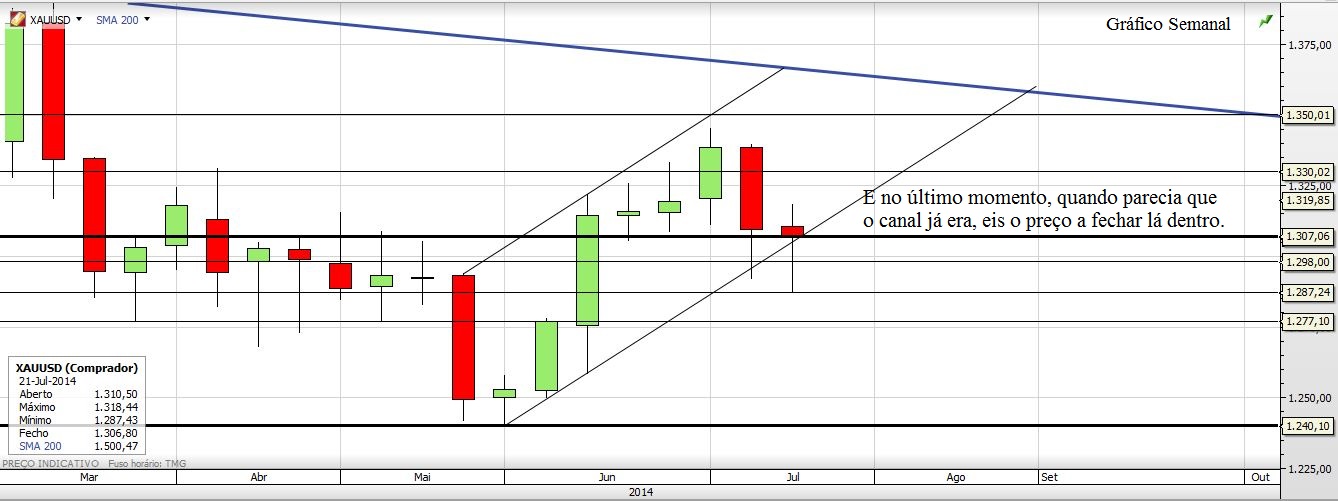 Agora deixo o que acho do Ouro. Curto ou Longo só para a semana mas acho que está mais para o lado dos curtos, quando chegar junto àquela LTA do gráfico de 4H. Até porque o canal do semanal está quebradíssimo.