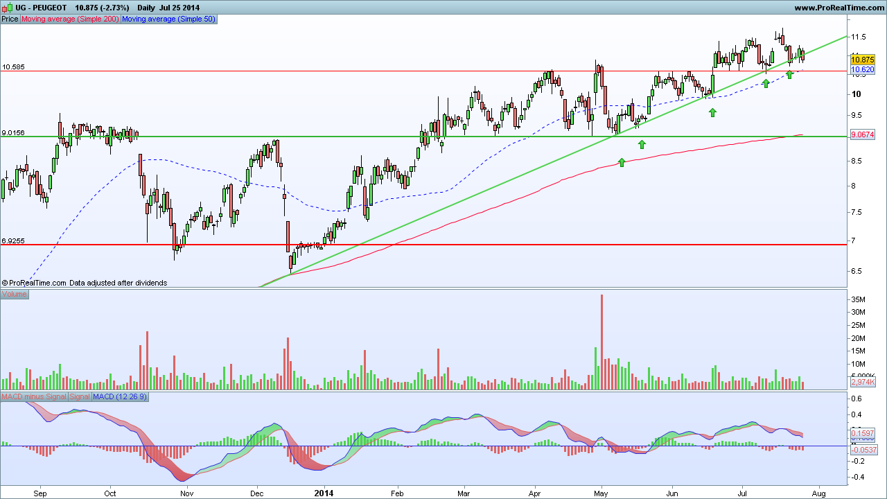 A moyen terme, Peugeot évolue au-dessus de sa moyenne mobile 100 jours (10.66). La distance par rapport à celle-ci est de 4.9%. A la hausse le niveau de résistance à considérer se trouve sur 13.1, le support se situe vers 9.4.