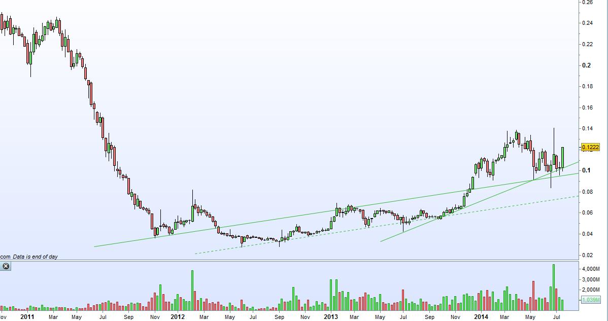 Em primeiro lugar há muitas resitências antes, a começar pelo máximo anterior, que também é máximo de alguns anos, nos 14 cêntimos! Depois disso nem acho que haja resistências significativas em nenhum nível porque estamos em território só "visitado" há muitos anos...
