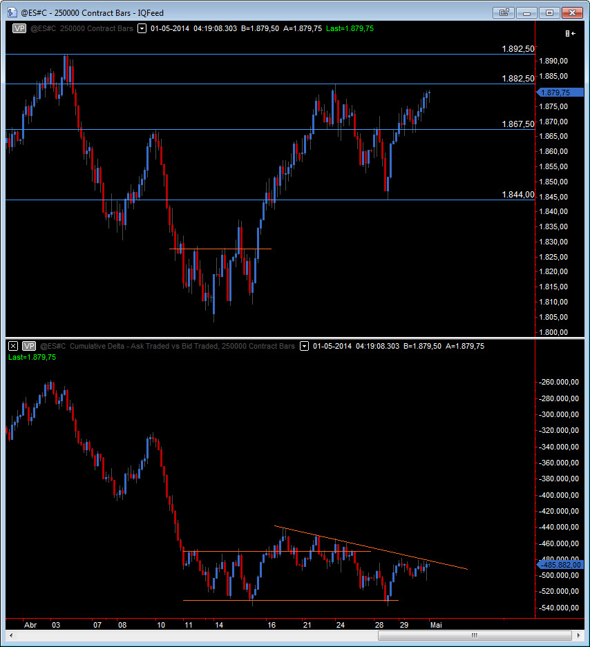 Se os preços conseguirem ir acima dos 82's será de extrema importancia seguir o delta pois caso exista uma reacção em alta, ou seja, indicando que os traders estão a negociar no offer, podemos ter um forte e rápido movimento de alta nos preços, indo facilmente para novos máximos com todo aquele inventário short a ser fechado. Os 1900 serão certamente o valor para onde os bulls mais olham neste momento.