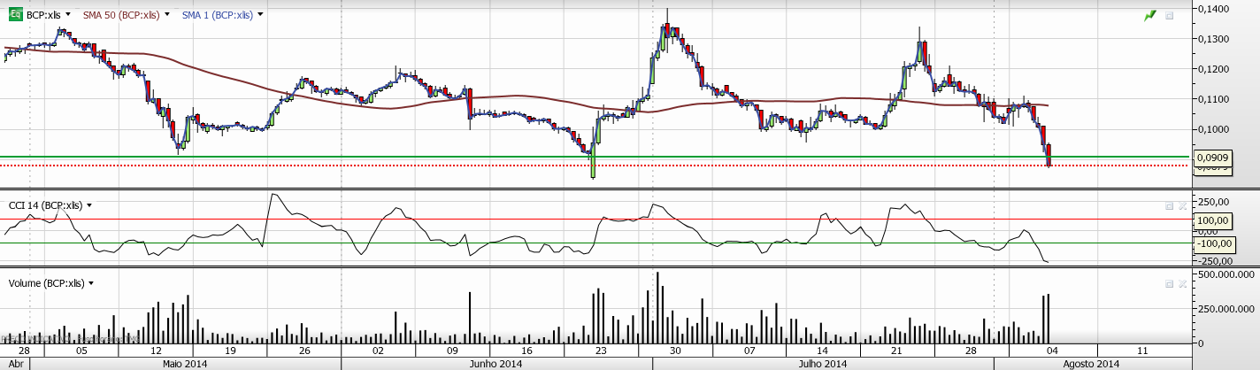 O bcp como se vê no gráfico semanal está a quebrar a SMA50, na minha opinião se na sexta feira quebrar mesmo, então tem boas probabilidades de vir aquela zona dos 0.06€, aí poderá então reagir.Neste momento no gráfico Diário, está sobrevendido e é provável que suba, pode até anular a quebra que está a fazer na SMA50 no gráfico semanal.