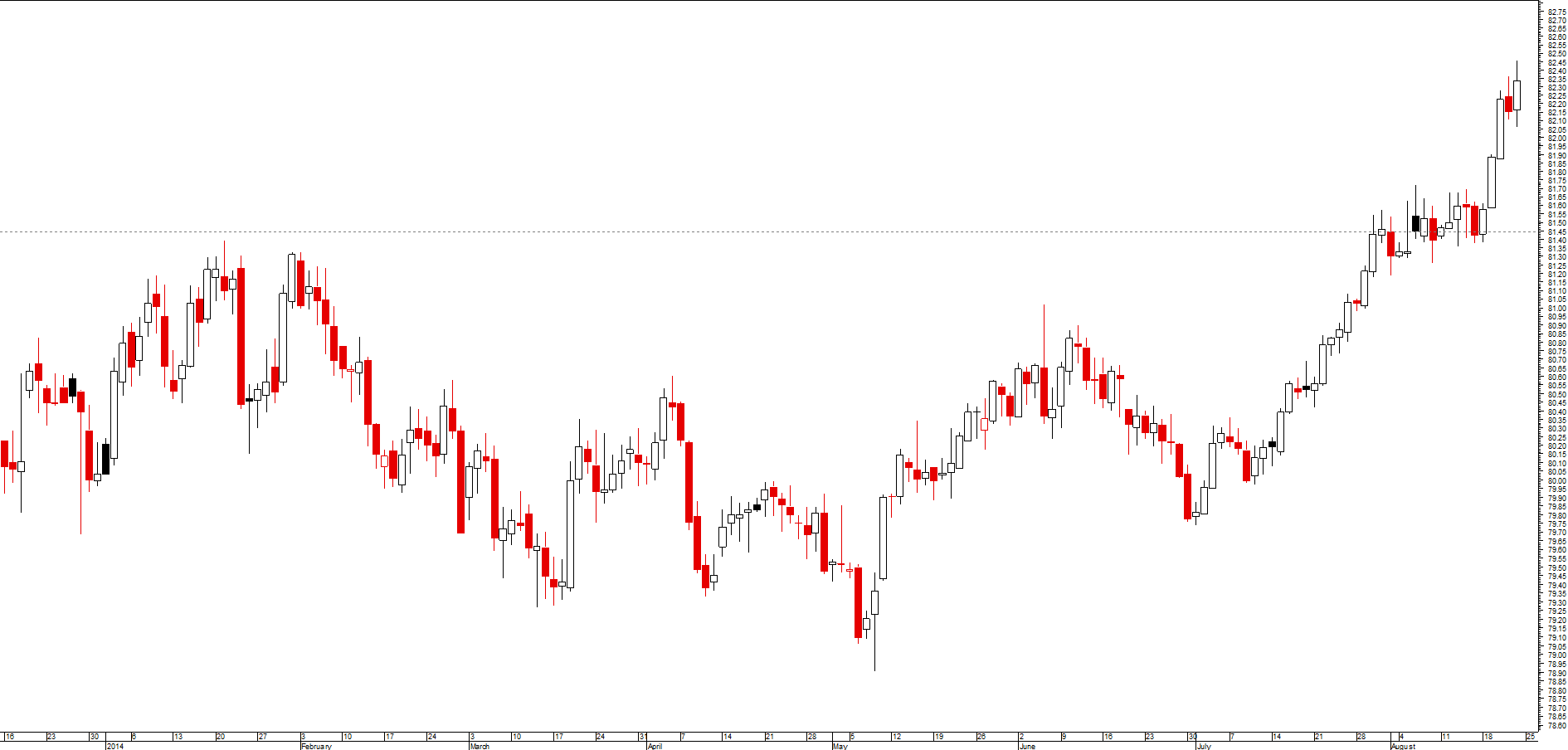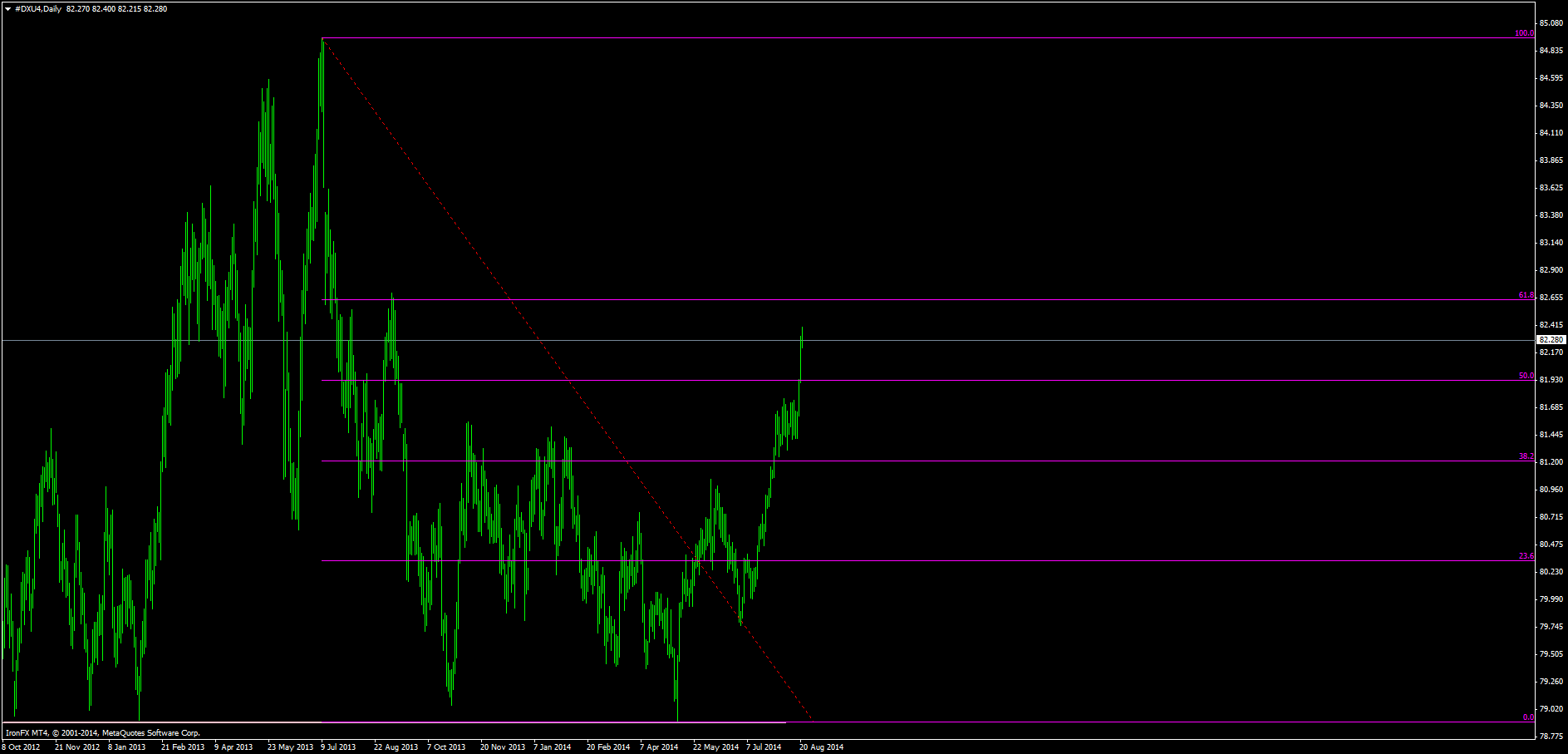 O DXU4 (futuro do DX para Setembro/2014, não vá ferir susceptibilidades) continua a sua subida meteórica e encontra-se nos 61,8 da retração da fibo no Diário.