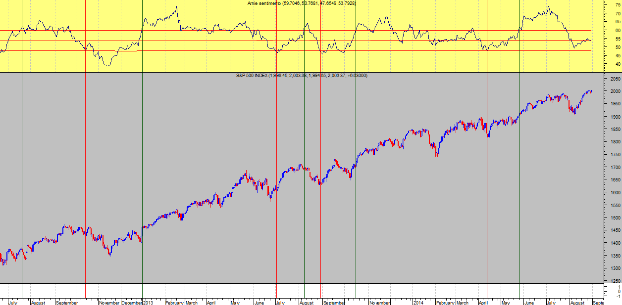 As regras de posicionamento tendencial testadas são muito simples: cada vez que o indicador de sentimento entra na zona acima da linha superior = comprar; abaixo da linha inferior = vender.