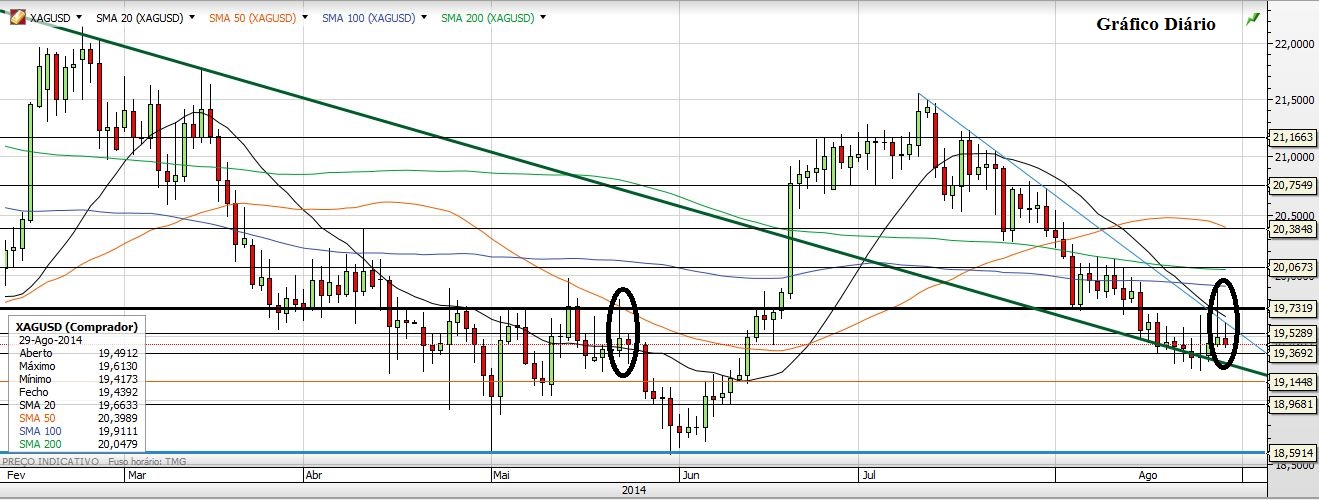 Quanto à Prata; quebrou o canal descendente em que o preço se vinha a desenvolver. Note-se também que a linha da hipotenusa do triangulo descendente (Inicio em Agosto 2013) aparou a queda da cotação.