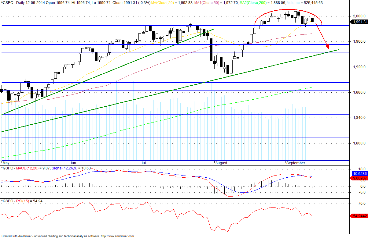 Sem nenhuma posição no S&P500, mas a olhar o lado curto. Para já nos índices americanos o NASDAQ fez um conjunto de velas muito horroroso, de realçar que a vela de ontem fez máximos de sempre. O DJ a fazer um duplo topo...
