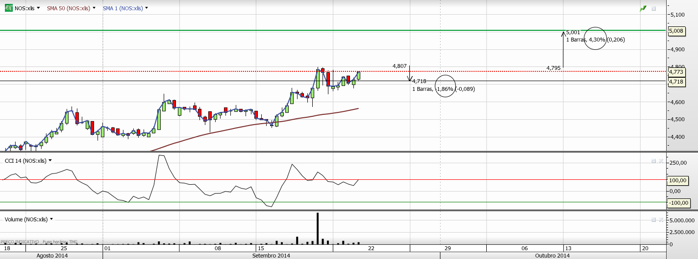 Tentei um trade longo na NOS mas devido a uma má colocação do stop fui stopado; a evolução da ação tem mostrado que seria um bom trade, ainda continua com algum interesse. No Gráfico abaixo apresenta um R/R de 2-1, com a hipótese de quebrar em alta a SMA50 no Semanal situada +- nos 5.00€.