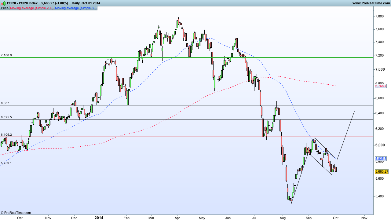 Na minha opinião o Psi estará a iniciar um movimento de mudança de tendência, uma vez que fez um fundo superior ao anterior, contudo o máximo ainda não foi realizado assim, prevejo dois cenários: