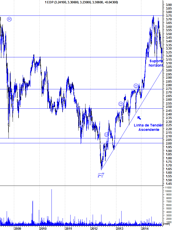 Apesar de tudo, a EDP é das acções que menos sofreu com o mau momento da Bolsa portuguesa e vale hoje mais do dobro do que valia em Julho de 2012, momento em que iniciou o seu “Bull Market”. Longe das grandes notícias, longe dos escândalos, longe das discussões dos investidores, a acção vai continuando o seu percurso e, depois destas correcções, encontra-se agora num importante local técnico.