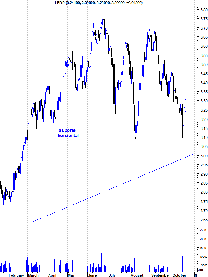 A EDP está junto a uma importante zona de suporte entre os 3,1 e os 3,18 euros. Esse suporte tem travado as quedas da acção nos últimos meses (Abril, Julho e Agosto) e uma quebra desse suporte seria uma importante vitória dos ursos numa acção que continua sob domínio dos touros. Abaixo desse suporte podemos ver a importante linha de tendência ascendente. Esta linha tem marcado o ritmo do actual “Bull Market” e todas as retracções junto a essa linha têm sido óptimas oportunidades de compra. Por isso, uma quebra dessa linha seria um rude golpe no actual “Bull Market”.