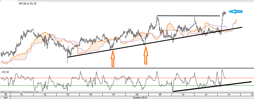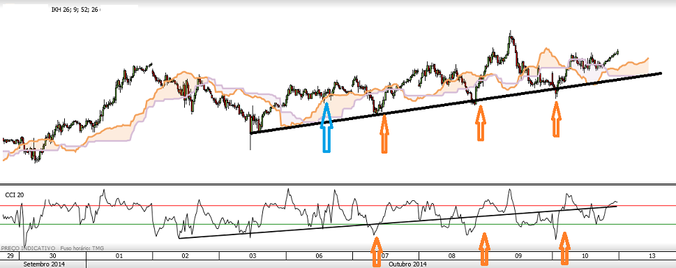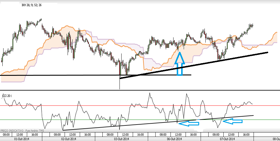 Os indicadores técnicos usados são o cci 20, a nuvem e linhas de tendencia.