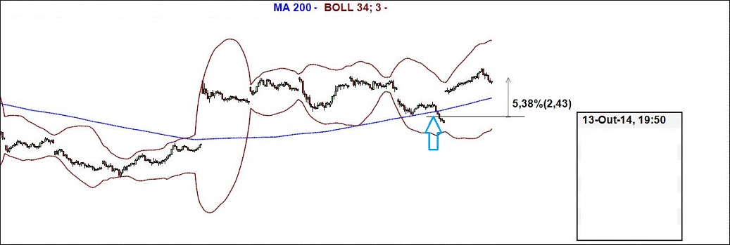 Preço negociando em contracção de volatilidade e circulando abaixo da mm 200, que servirá de resistência. Triplo topo. Demos ordem de venda do activo para a abertura da próxima vela, com a intenção de obtermos o lucro habitual neste tipo de negócios contra um risco calculado.Descrevendo os indicadores técnicos usados pelo 2º estarola do grupo: bb 34,3 e mm 200. A bb destina-se a tentar apanhar momentos de contração da volatilidade abaixo e acima da mm 200 e negociar de acordo com a tendência ou o regresso à mm, dependendo da distância em dias e pontos (cálculo estatístico) do preço à mesma