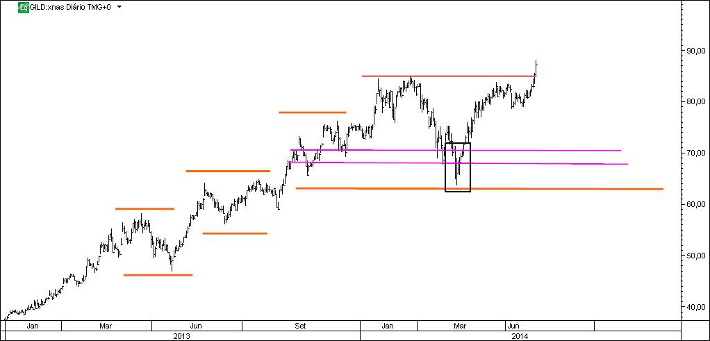 Gild (já mencionado):tendo feito novo máximo, fica confirmado o último mínimo, o que nos poderá dar um local para colocação da stoploss.