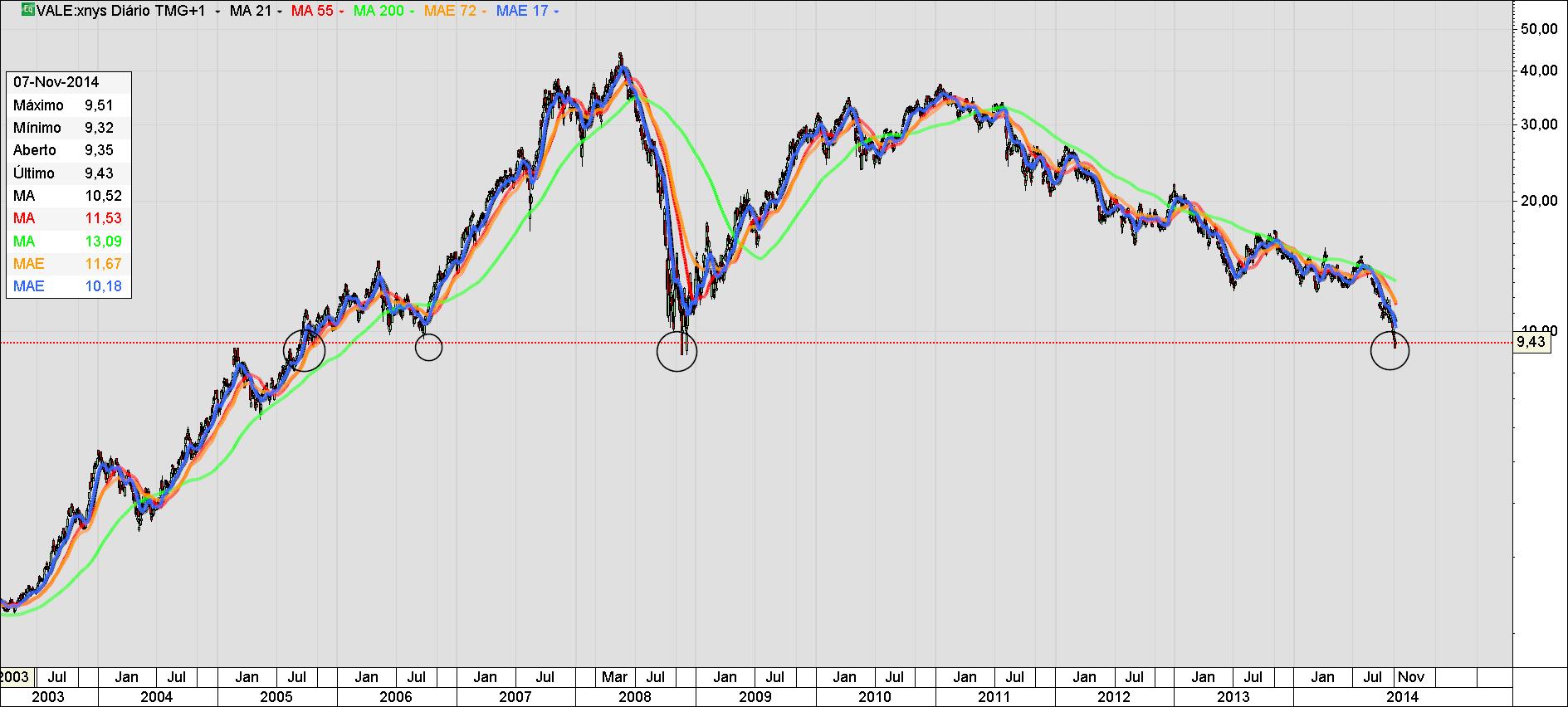 Aqui nestes toscos gráficos poderemos observar esses fundos, que não há por onde se pegar. É o limite da existência entre um improvável sucesso de curto prazo, o menos improvável medio prazo e poderíamos ter algum sucesso num prazo mais alargado dependente da reação económica global. A VALE e todo seu potencial como na generalidade do portfolio Brasil, portfolio este representado pelos ADRs NYSE Brasil, porque não é o mesmo que se verifica se conseguíssemos ter acesso a generalidade das cotadas do IBOVESPA que é um grande negócio. Temos no IBOVESPA cotadas a fazer belos números antes, durante e após as eleições, de maneira consistente, com bons fundamentais e excelentes perspetivas de futuro. É inevitável falarmos da politica económica mundial e a filosofia da politica nacional brasileira e seus projetos para o planeta. Poderá ser aqui a grande diferença entre a ação e a reação. O Brasil está agindo e o mundo reagindo. É um misto de exercício do domínio entre o dominado e o revolucionário. Complicado não é? Não, não é.