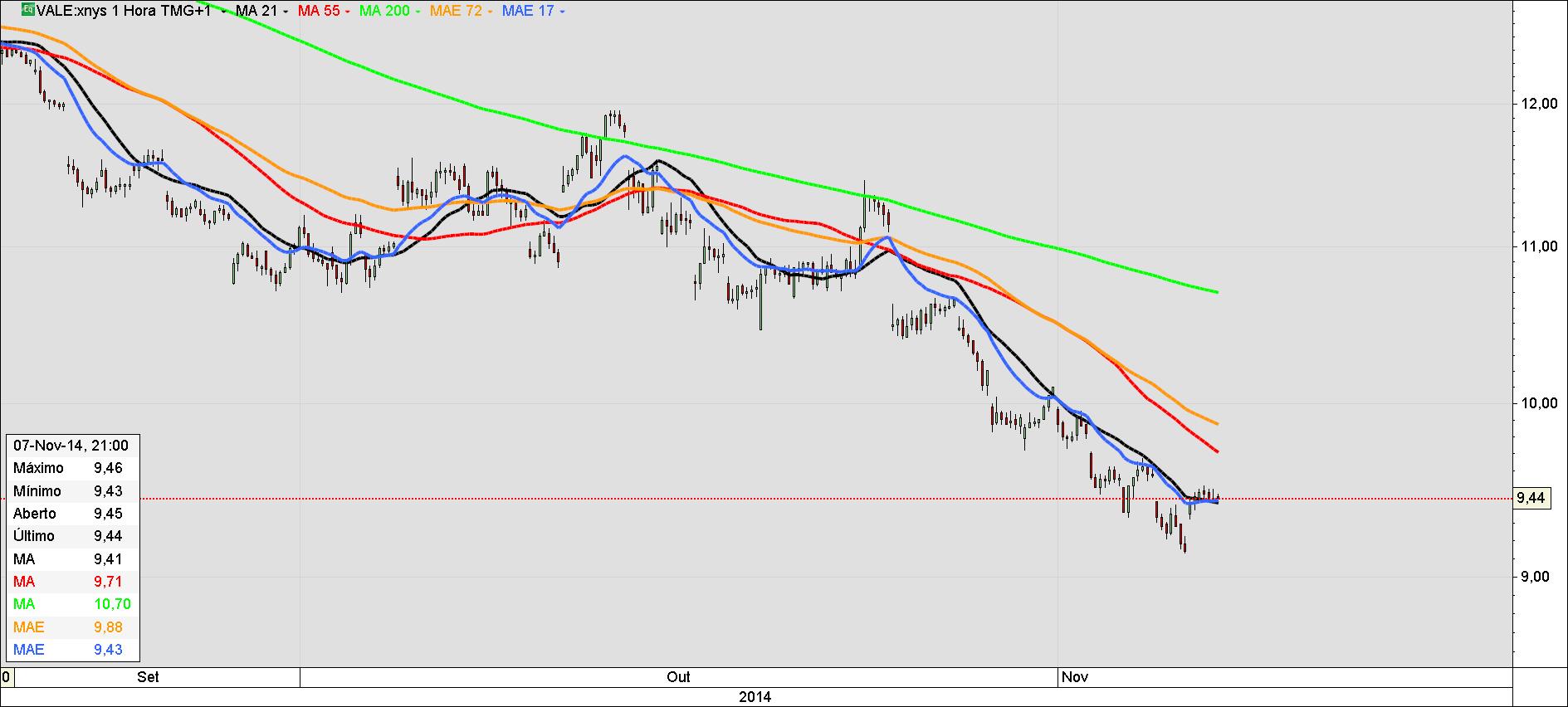 No gráfico diário, semanal e mensal a VALE está sobre o fio da navalha, e o único gráfico que promove alguma "esperança" é o gráfico de 60min. que demonstra uma possível inversão de tendência de curtíssimo prazo, retornando novamente ao espelho de seus fundamentais, pois a politica poderá até dar algum impulso, mas quem determina a realidade são os fundamentais das cotadas. Sem duvidas algumas que após a reunião dos G20 e o cenário politico mais composto, o mercado vai reagir positivamente, resta-nos aguardar para ver até onde haverá consistência e até onde o mundo estará disposto em apoiar e participar do projeto politico do Brasil eleito que não está a dar sinais de grandes alterações, mudanças haverão isso é certo, mas a linha central, não, não vai alterar-se, ainda bem para todos os brasileiros e melhor ainda para o mundo. ´