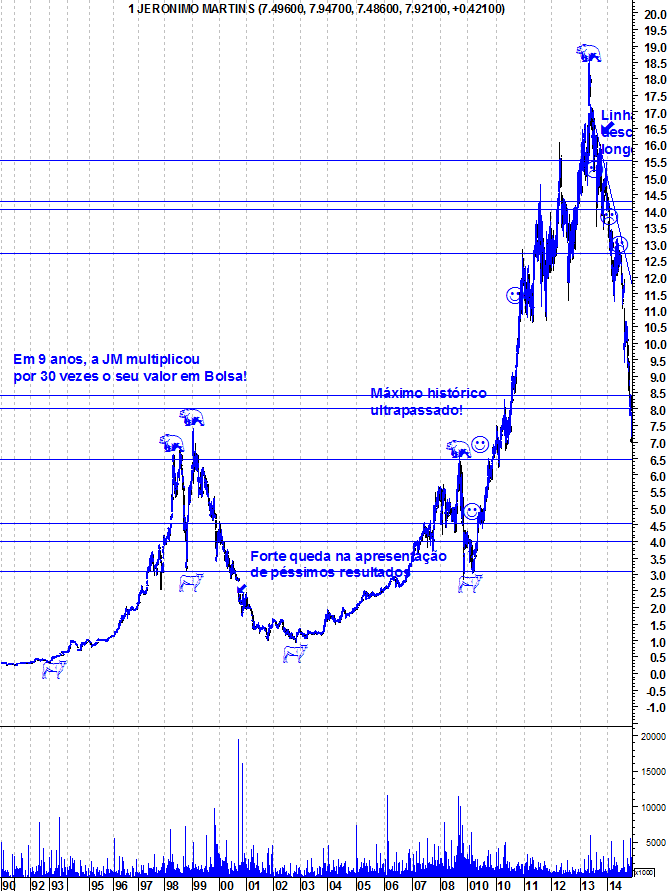 O mais interessante na JM é que pode ter feito ali um "gap" de exaustão. Um ano e meio de quedas e um "gap" com volume fortíssimo, pode ser exaustão de vendas. Veremos. Para já, está a chagr à sua primeira zona de resistência entre os 8 (zona do "gap") e os 8,4 (último mínimo relativo).