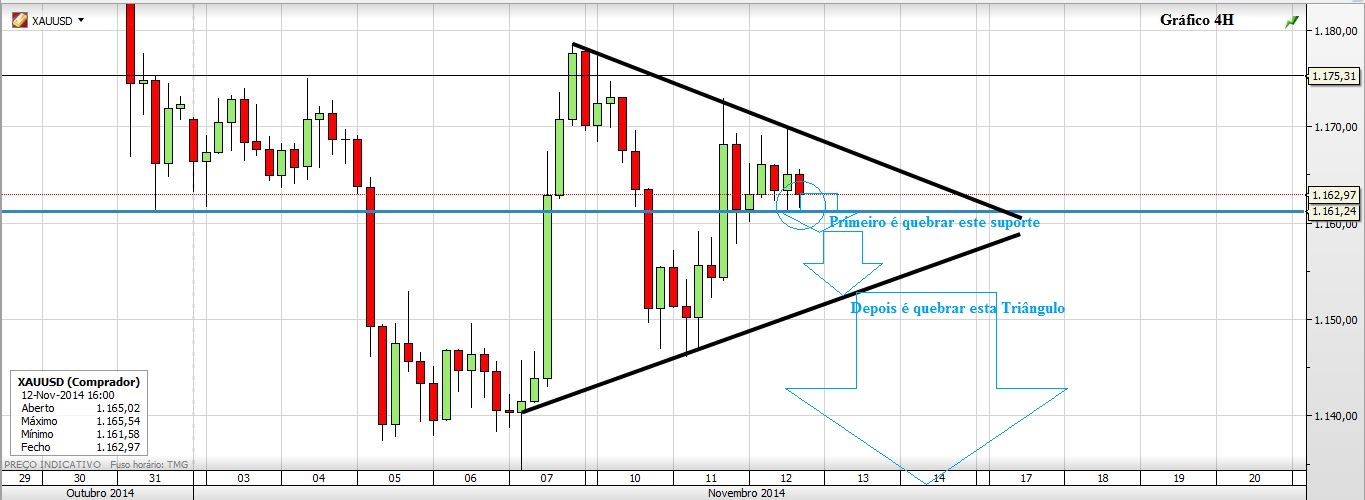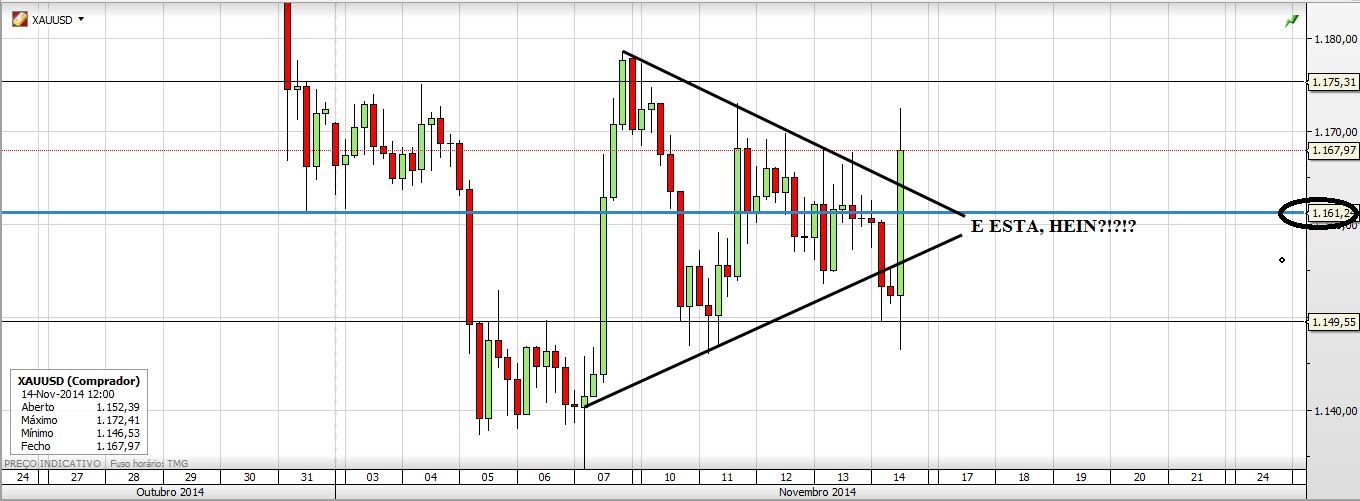 Fechei o meu Curto no Ouro. O Triângulo Simétrico estava a ir bem, o Preço quebrou em baixa, foi novamente testar a base do triângulo e depois começou a vir por ai abaixo até que.... resolveu ir por ai acima... quando quebrou os 1161 fechei a minha posição.