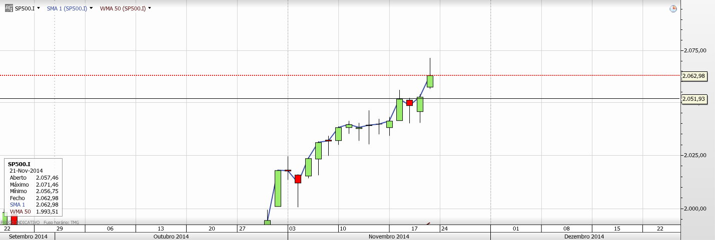 ricardmag Escreveu:Mensagem por ricardmag » 13 nov 2014, 21:04A minha previsão é que durante a próxima semana o SP500 venha visitar a EMA20 perto dos 2000