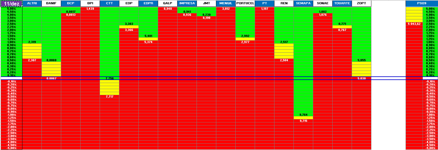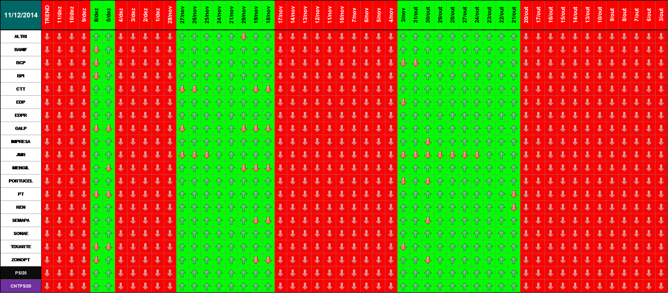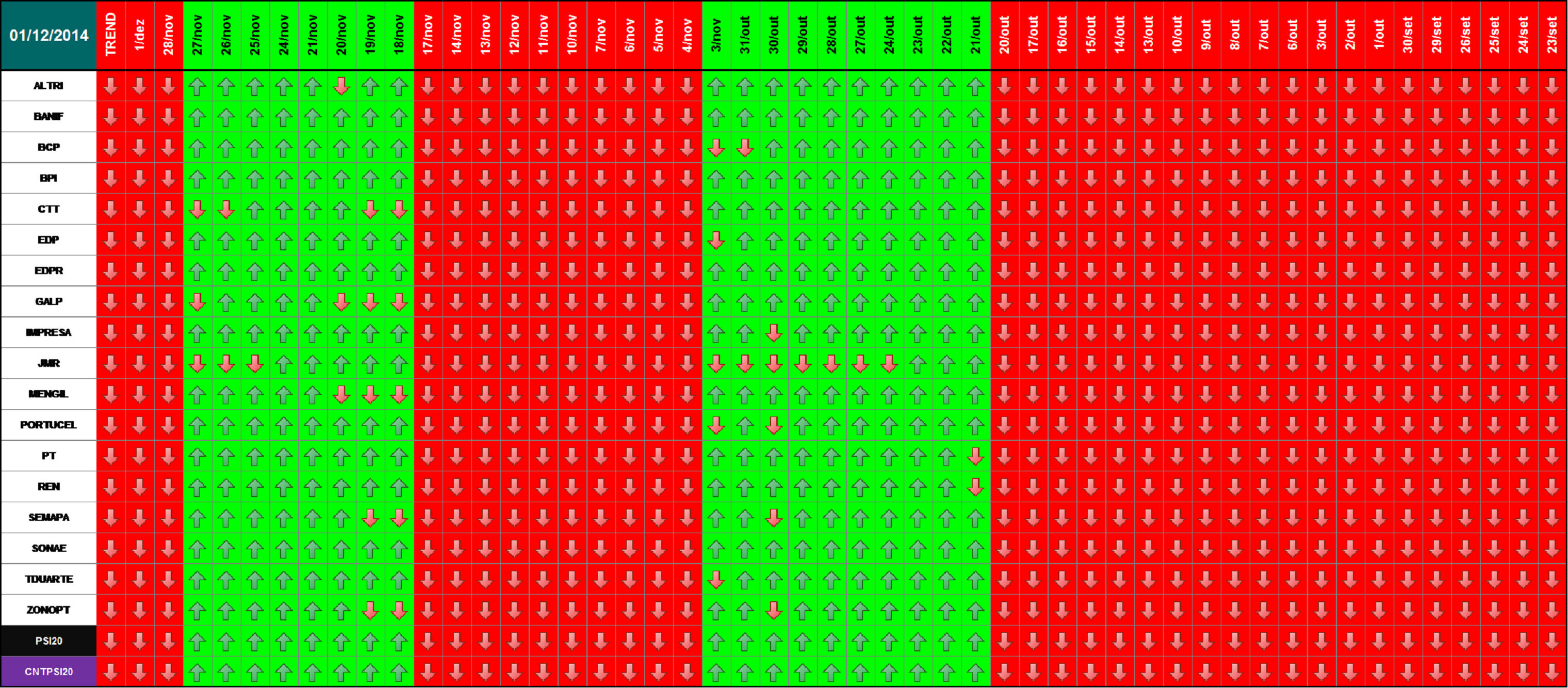 Nota: A informação apresentada resulta da construção de um modelo matemático suportado na análise do histórico das cotações das empresas do PSI20. Após vários anos de investigação pareceu-me que estariam reunidas as condições mínimas para disponibilizar esta informação (no meu entender útil) que facilitasse a tomada de decisão de entrar, ou não no mercado. Trata-se do resultado atual de algo que se encontra em melhoria continua e, portanto, não acabado. É uma mera proposta alternativa de outra forma de "olhar" para as tendências do mercado e por isso tem uma validade relativa que carece da análise crítica de cada investidor antes de qualquer tomada de decisão de investimento. Esta nota em última análise tem o intuito de informar que não me poderá ser imputada qualquer consequência resultante da informação aqui disponibilizada.