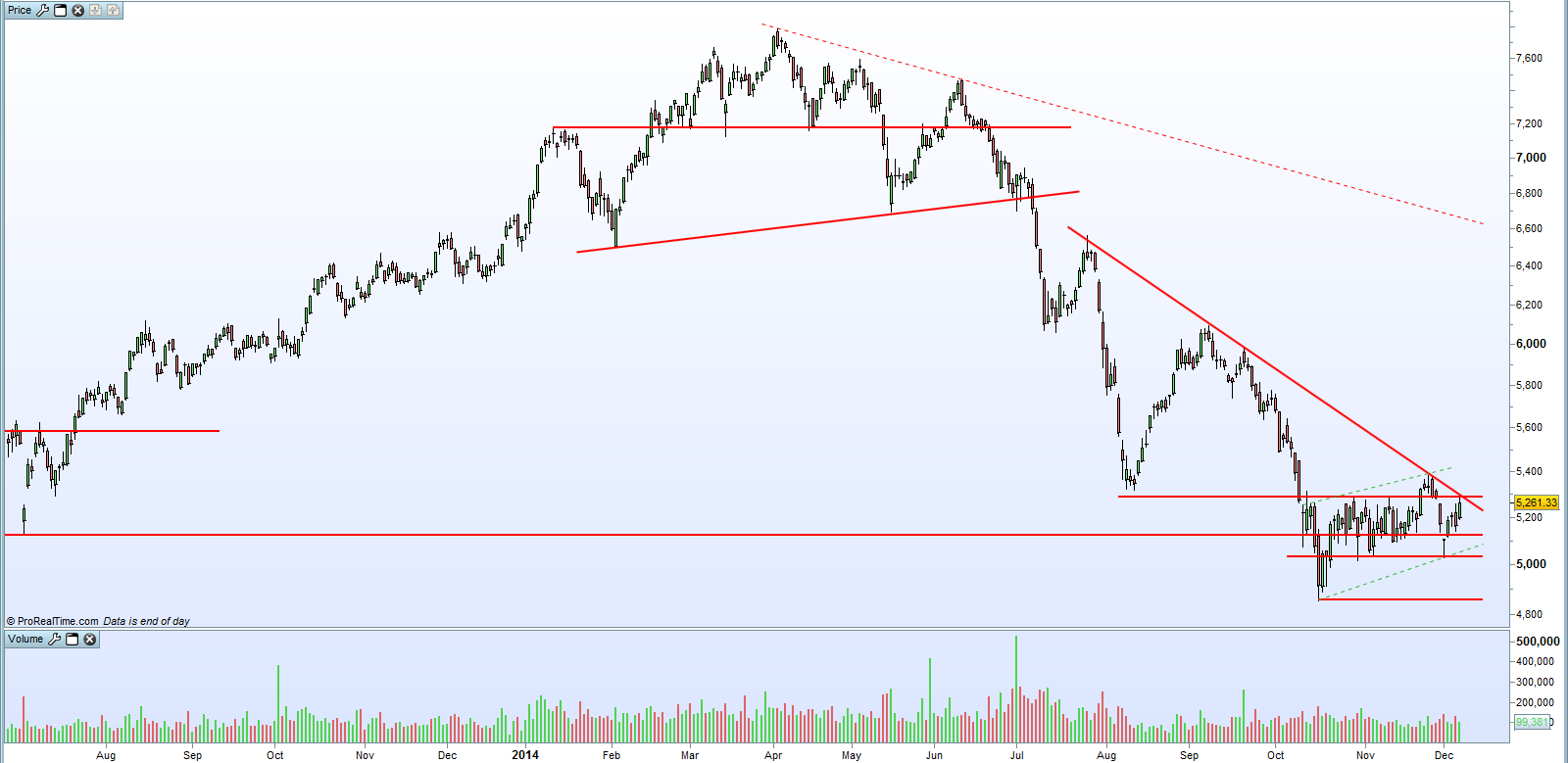 Nos dias 5 e 8 de Dezembro volta a testar a LTDCP e ao não conseguir passar esse obstáculo dá um claro sinal de fraqueza que acaba por ser confirmado não só por vir abaixo das duas linhas a verde (a primeira de muito curto prazo já tinha alguma solidez técnica – 4 pt), mas especialmente por vir abaixo dos 5020 / 5000.