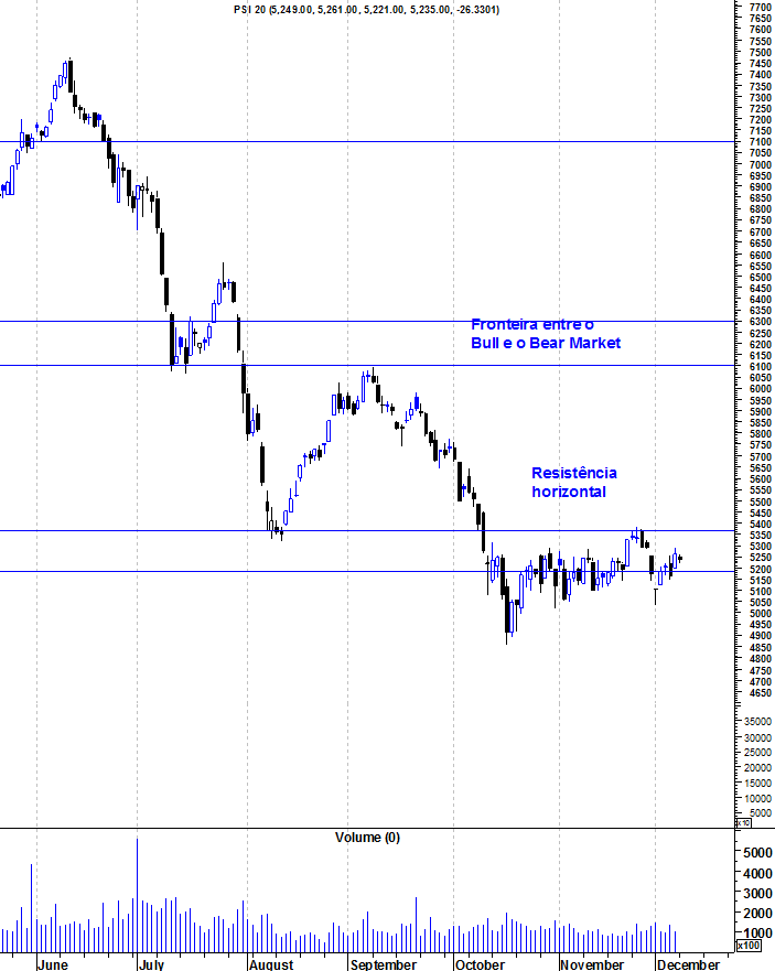 Acredito que a zona entre os 5350/5400 poderá exercer alguma pressão vendedora, conforme assinalei no gráfico. Caso ultrapasse essa zona sem dificuldade, é porque os bulls estão a começar de aparecer.