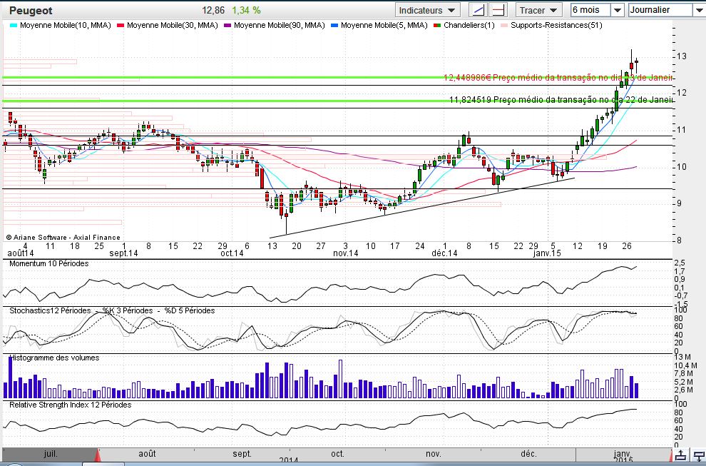 Bons resultados, boas noticias e a quebra de uma importante resistência na zona dos 12 marcaram estas ultimas semanas da Peugeot, o caminho tudo indica será para cima, os touros pegaram nela, acredito que com uma ou outra correcção o "céu será o limite"... talvez possa subir até à zona dos 23 onde encontrou uma resistência no final de 2010 e inicio de 2011 e meio de 2011.
