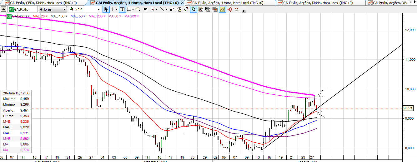 No seguimento do que venho dizendo há uns dias (o preço não é sustentável a este nivel com o petróleo tão baixo e o euro a niveis baixissimos), vendi tudo o que tinha a 9,20 (100k). Estou a acumular desde então outra vez. Acredito numa descida mais ou menos profunda conforme o preço do petróleo. O petróleo está no limite minimo e se quebrar pode ir aos 35-40$ pelo que se abre mais uma excelente oportunidade de acumular. Quebrou a EMA 50(9,30) e a TL UP de curto prazo e para mim o próximo degrau é a EMA 20 (8,76). Acredito que a sustentação actual se deve mais à proximidade do anúncio dos resultados do 4ºT do que a outra coisa. Minha sugestão: ir acumulando mas com calma pois 9,00 não é propriamente uma pechincha para quem há 2 semanas estava a 8,00 com o petroleo a niveis ligeiramente superiores ao actual e euro muito mais elevado.