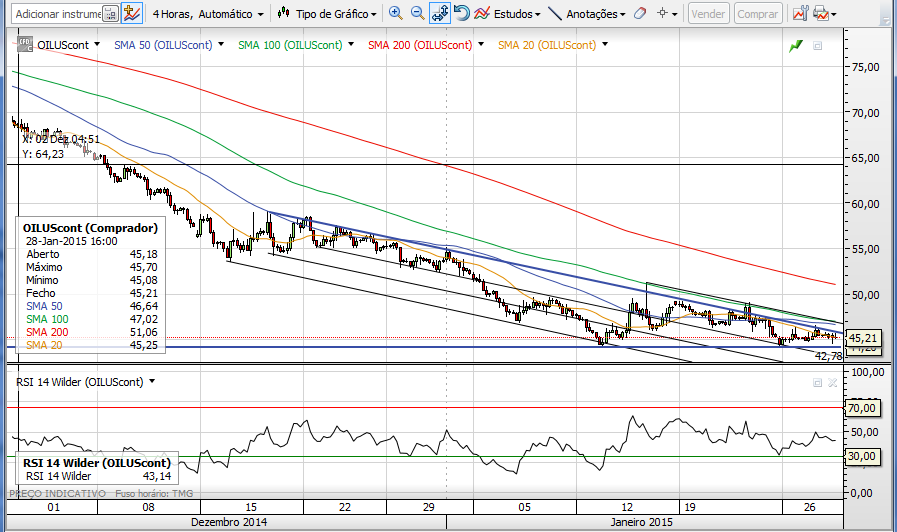 No entanto a consolidação que mencionas no OILUK é de realçar, e que também se verifica no OILUS mas num gráfico de 4h, no entanto a minha leitura do RSI parece estar a indicar próximos novos minimos de curto prazo (inferior a $44,20).