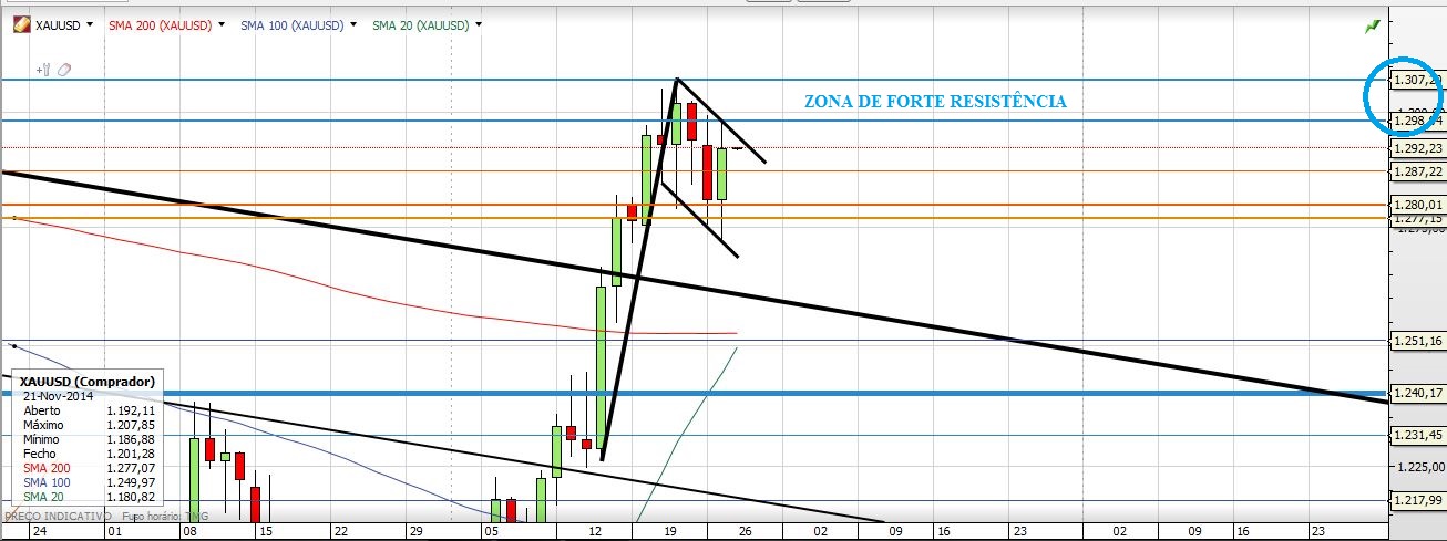 Hoje meti uns Longos no Ouro, embora nada de exageros... mas parece que está ali uma BullFlag... não se pode dizer não a uma BullFlag... De qualquer maneira a grande resistência é a zona dos 1298 aos 1307 e o suporte está nos 1277/80. Passando a resistência o Preço tem tudo para ir aos 1330 ou até mesmo aos 1350.