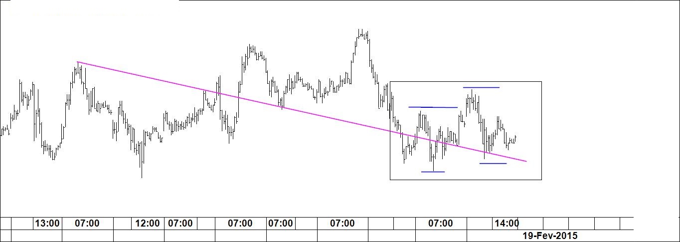 O gráfico 2 destina-se a fazer o acompanhamento do padrão "V na linha". Também se aproxima a hora da verdade. Pode aguardar-se que o preço se digne fazer o movimento desenhado. Neste padrão a técnica nada tem de complicado: vende-se o topo e compra-se a base. O inverso deve ser feito quando se estiver perante o "V invertido na linha".