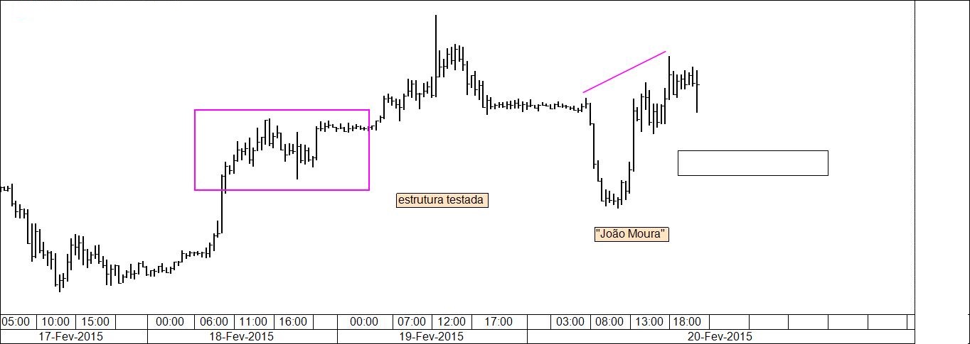 Gráfico 1: estrutura testada com um "João Moura". A reacção é, no meu critério, suficientemente indicativa da presença de compradores na zona, de tal modo que será colocada ordem de compra na zona assinalada com stoploss abaixo do "João Moura" em medida adequada ao atr do timeframe em causa. O target será um novo high.