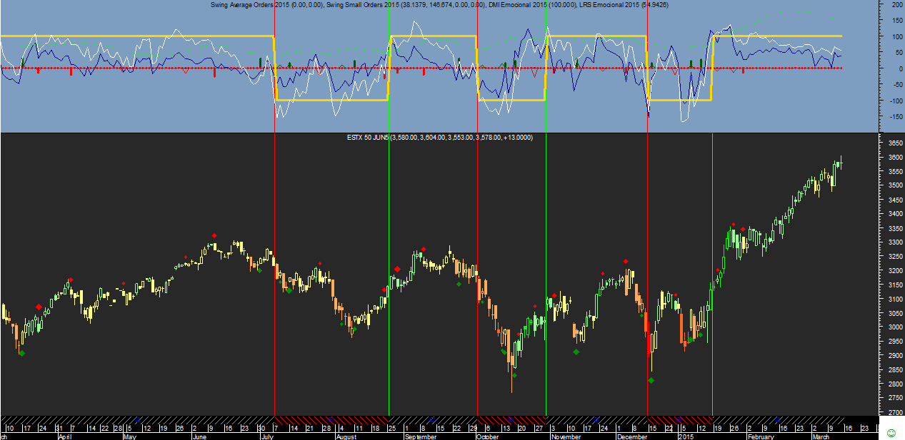 Sempre que ocorre um sinal de compra tendencial, indicado por uma linha verde vertical, a linha amarela “bold” passa para terreno positivo a marcar o valor de +100 pontos no gráfico dos indicadores.